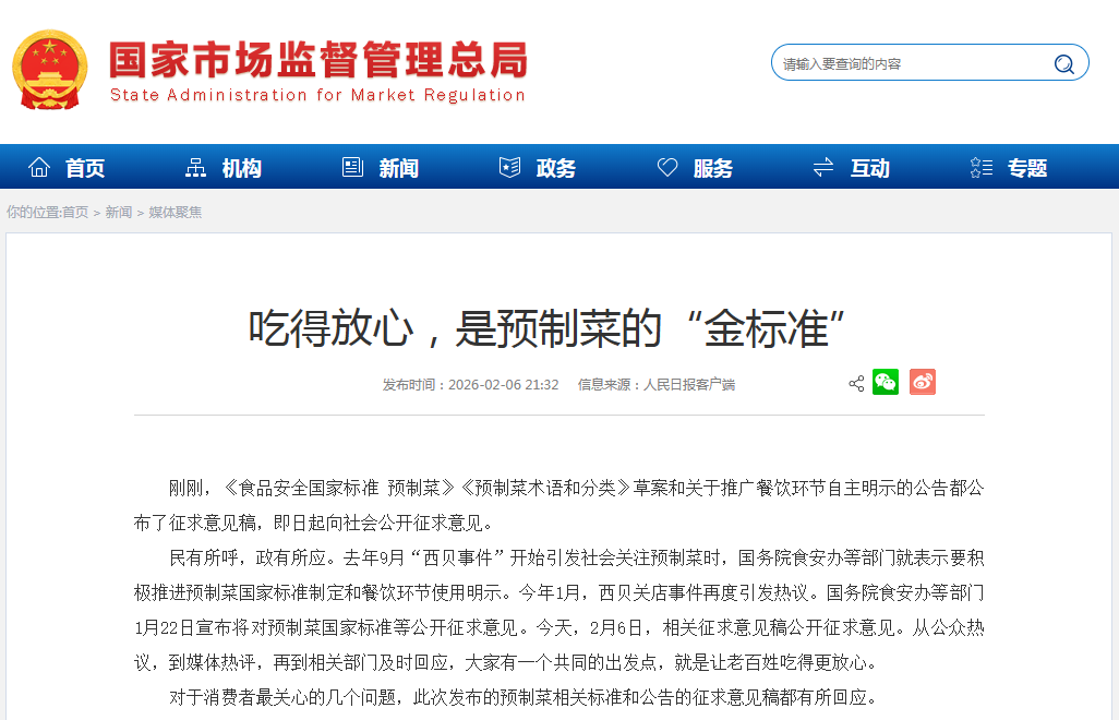去年9月的“西贝事件”引发了全社会对预制菜在餐饮业使用的广泛关注与讨论。国务院食安办等部门随即表示将积极推进预制菜国家标准的制定工作。今年1月,相关话题再度升温,相关部门于1月22日宣布将就国标公开征求意见。今日(2月6日),征求意见稿如期发布,标志着预制菜监管体系建设迈出关键一步,共同目标是让老百姓吃得更放心。